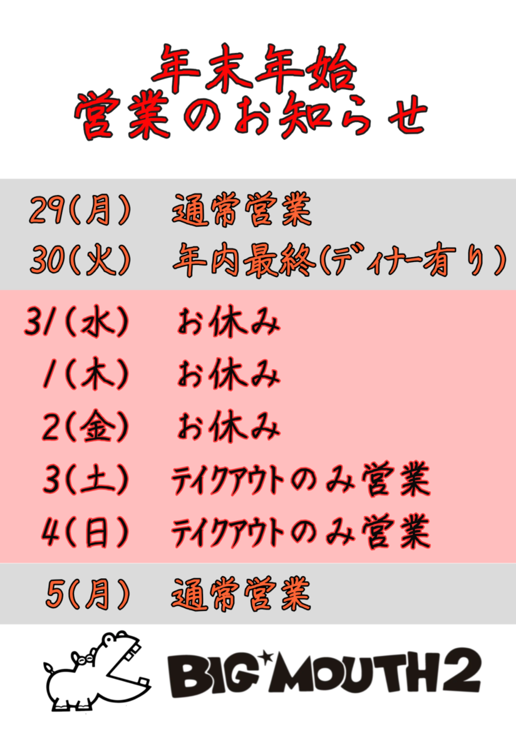 未分類 BIG MOUTH22025-12-22 年末年始のご案内です。 3日、4日は店内飲食はできませんので、ご注意ください。また両日とも、ワンオペとなりますので、予約のお電話をいただけると幸いです。 アルバイト募集中!(誰か助けてください) 年末年始のご案内